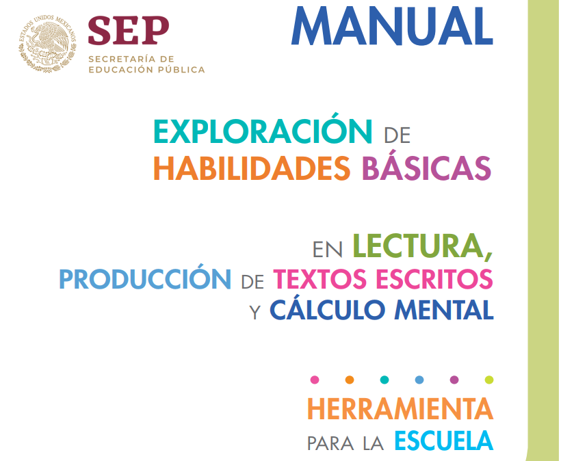 El Manual Exploración de habilidades básicas en lectura, producción de textos escritos y cálculo mental. Herramienta para la escuela, es una publicación de la Dirección General de Desarrollo de la Gestión Educativa, de la Subsecretaría de Educación Básica, de la Secretaría de Educación Pública. PRIMARIA_Escuela_ Exploración-Habilidades